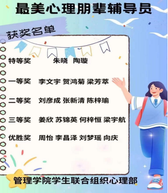 以鼓励朋辈为出发点,于2023年10月中旬举行了“最美心理朋辈辅导员”风采展活动。本次活动由管理学院学生联合组织心理部和易班管理中心承办,面向管理学院全体学生。