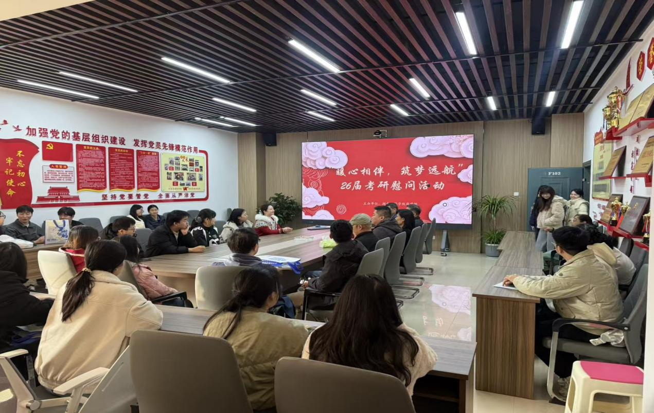 “愿这一点心意,陪伴你穿过书山题海;愿这一份鼓励,照亮你前行路上的光。”此次慰问活动不仅为考研学子送上了物质上的关怀,更给予了宝贵的精神支持,极大地振奋了士气。同学们纷纷表示,学院的关爱让他们倍感温暖与力量,必将以更加饱满的热情、更加从容的心态走好备考的“最后一公里”。