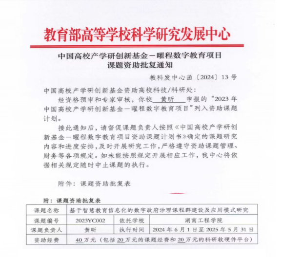 近日,教育部高等学校科学研究发展中心发布了《中国高校产学研创新基金——曜程数字教育项目课题资助批复通知》(教科发中心函〔2024〕13号),我校党委书记黄昕教授申报的课题“基于智慧教育信息化的数字政府治理课程群建设及应用模式研究”列入“2023年中国高校产学研创新基金——曜程数字教育项目”资助课题计划,这是我校首次获得教育部该类项目资助。