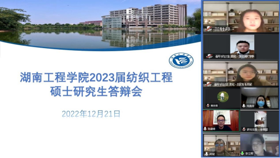 2022年12月21日下午3点,管理学院举办纺织工程专业硕士毕业论文答辩会。本次答辩会采取线上方式进行,来自湖南师范大学的李立辉教授担任本次论文答辩主席,企业专家崔毓剑董事长、陈建雄董事长,以及管理学院李轶敏教授、纺织工程学院何斌副教授担任答辩专家,学院低年级研究生及部分导师代表全程旁听了答辩。