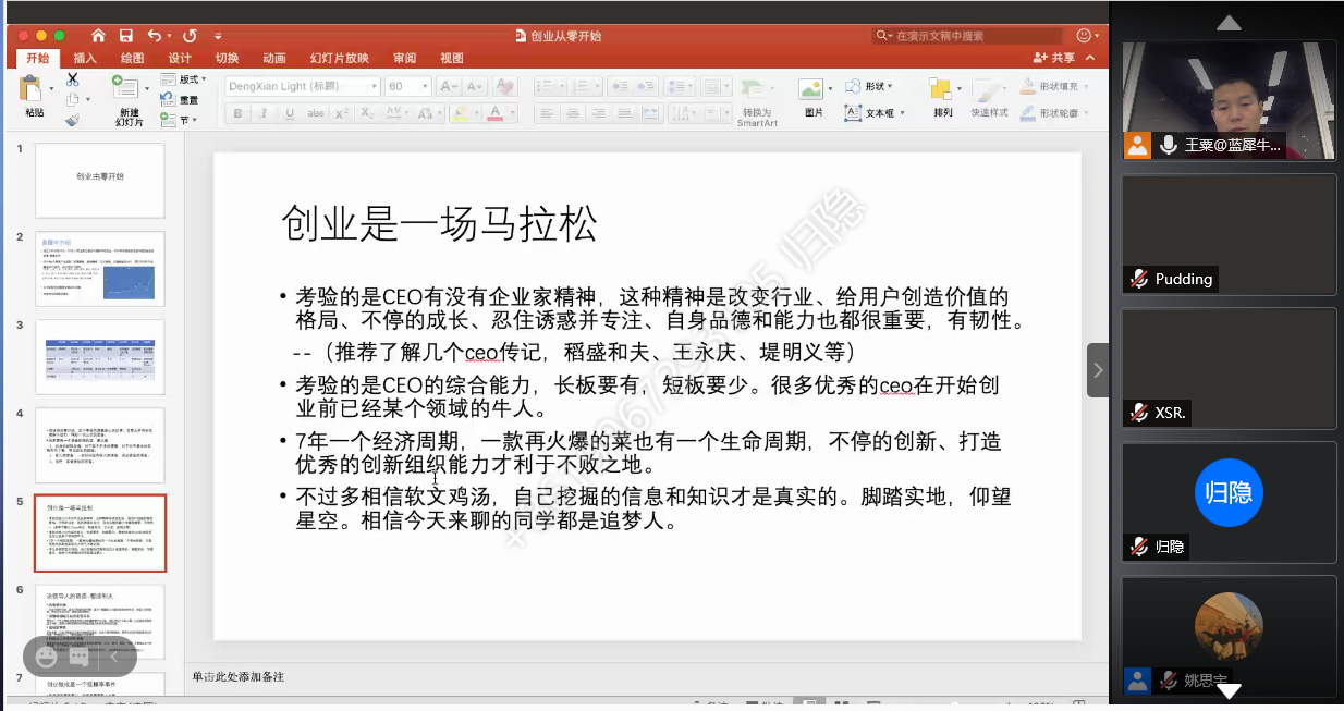 王粟从“蓝犀牛搬家”、“创业的必备要素”,“外部融资”三个方面讲述了大学生应该如何创业。首先,他向同学们简单地介绍了蓝犀牛搬家的发展历程、产品类型、业务范围和蓝犀牛搬家现今发展态势。随后,王粟跟同学们讲述了作为领导人应该具有的综合能力、经验准备、企业精神以及优秀的团队等。他形象地将创业比作一场马拉松,只有坚定目标不放弃的人才可能成功。同时,王粟表明创业做成是一个低概率事件,必须结合自身能力、外部机遇、科学的方法论和企业的班子建设才能创业成功。最后,他带领着同学们从融资的角度看资本市场的活跃曲线,让同学们对外部融资,现下市场环境有了更深一步的了解。